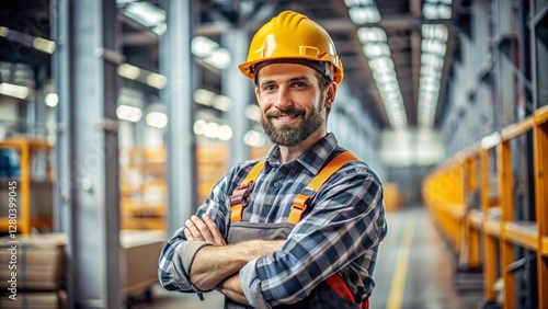 Portrait of Successful Builder / Worker / Contractor Wearing Hard Hat and Safety Vest Standing on a Commercial Building Construction Site, Crosses Arms Confidently