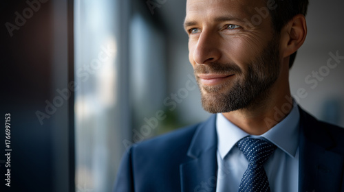 Portrait of successful businessman in office tie and suit detail head cropped at eyes soft window light corporate confidence faceless no visible faces executive portrait