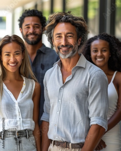 Portrait of successful group of business people at modern office looking at camera. Portrait of happy businessmen and satisfied businesswomen standing as a team. Multiethnic group of people smiling.