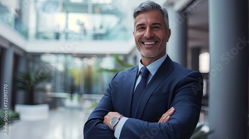 portrait of successful senior businessman consultant looking at camera and smiling inside modern office building
