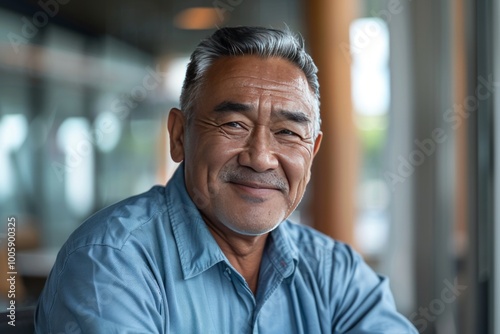 Portrait of successful senior Pacific Islander businessman consultant looking at camera and smiling inside modern office building , background blur