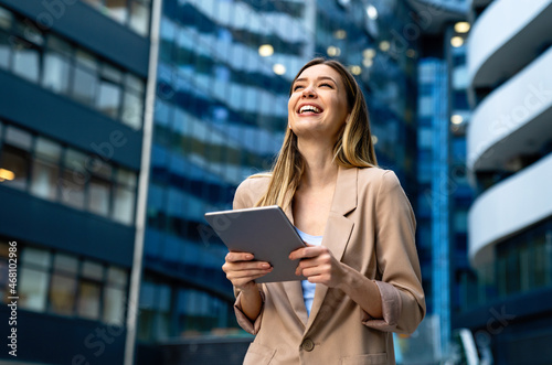 Portrait of successful woman using digital tablet in urban background. Business people concept