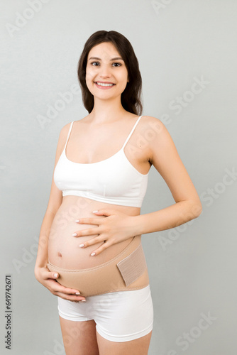 Portrait of supporting bandage on pregnant woman in underwear at gray background with copy space. Orthopedic abdominal support belt concept