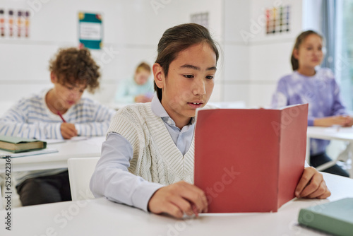 Portrait of teenage boy sitting at desk in school classroom and reading book with group of kids in background