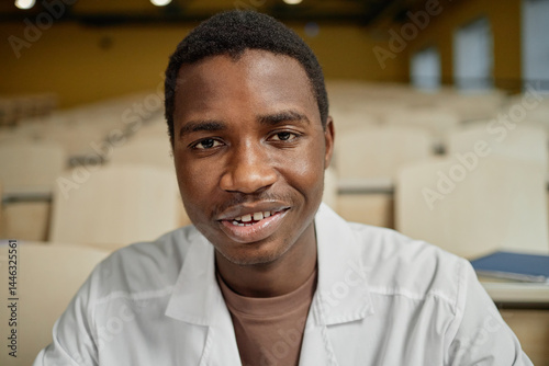 Portrait of teenage boy with bleached blond hair wearing lab coat as med student sitting in lecture hall and using laptop, copy space