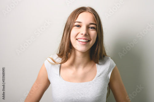 Portrait of teenage girl in casual t-shirt on light background in studio.