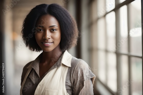 Portrait of the smiling an African American female factory worker and industry background. Generative AI