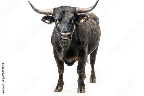 Portrait of the strongest dark brown bull with muscles and long horns on a clear png background, an Animal Fighter concept.