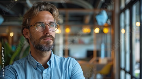 Portrait of thoughtful bearded man with glasses in casual wear looking out window with bokeh background indoor lighting