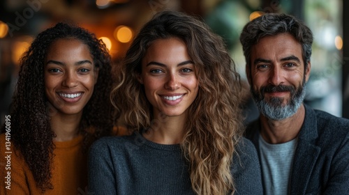 Portrait of three diverse smiling people, a young woman with wavy hair in the center, a curly-haired woman on the left, and a bearded man on the right, standing closely in a warmly lit cafe.
