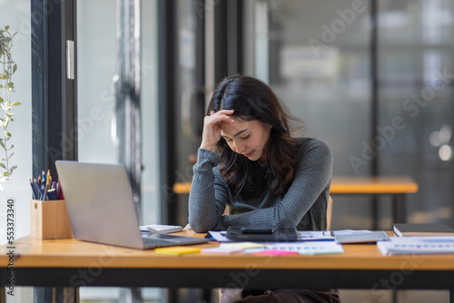 Portrait of tired young business Asian woman work with documents tax laptop computer in office. Sad, unhappy, Worried, Depression, or employee life stress concept
