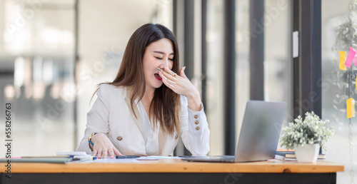 Portrait of tired young business Asian woman work with documents tax laptop computer in office. Sad, unhappy, Worried, Depression, or employee life stress concept.