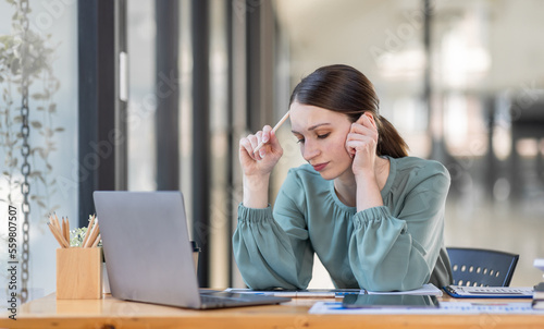 Portrait of tired young business Canada american woman work with documents tax laptop computer in office. Sad, unhappy, Worried, Depression, or employee life stress concept