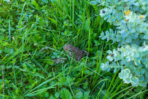 Portrait of toad sitting in green grass.