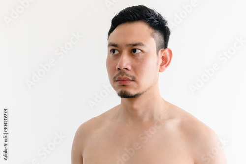 Portrait of topless Asian man with serious face on isolated background.