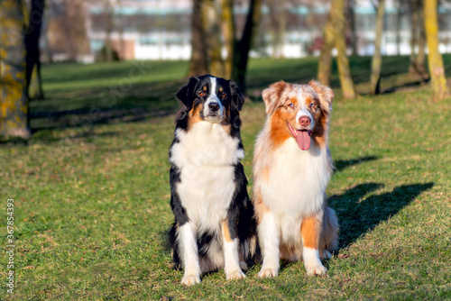 Portrait of two Australian shepherd dogs in Park an outdoor