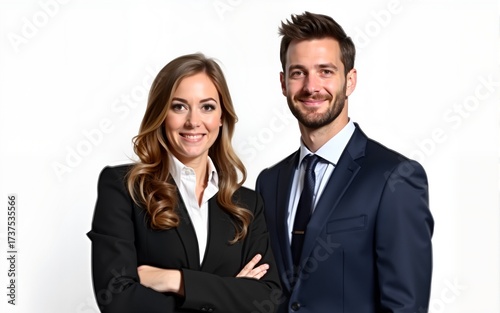 Portrait of two businesspeople looking at the camera against a white background. High quality