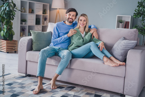 Portrait of two careful attractive cheerful people sitting on divan spending weekend life at home indoors