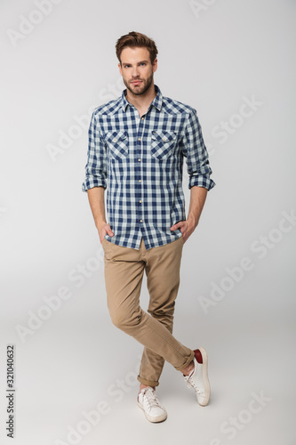Portrait of unshaven young man posing on camera with hands in pockets