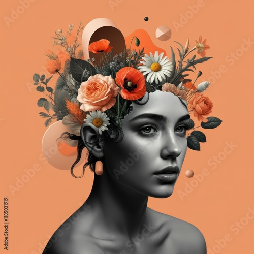 Portrait of woman, floral headdress, red poppies, grey roses, daisies, monochrome face, orange background, surreal, elegant, fashion photography style, high contrast, detailed, realistic textures, blo
