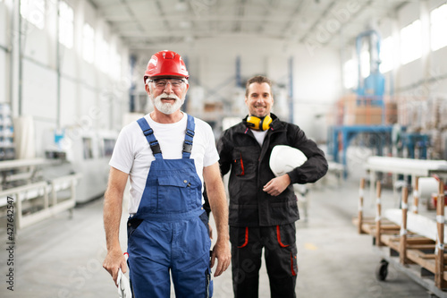 Portrait of workers in factory. Colleagues with helmet working in factory