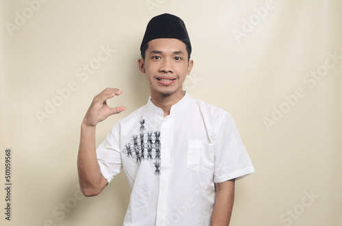 Portrait of young Asian Muslim man showing small size with his hands. isolated background