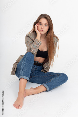 portrait of young attractive caucasian woman with long hair in suit jacket and blue jeans isolated on white background. skinny pretty female sitting on floor at studio. model tests of beautiful lady
