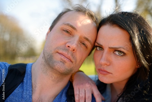Portrait of young attractive couple having emotional fun tomfoolery together.