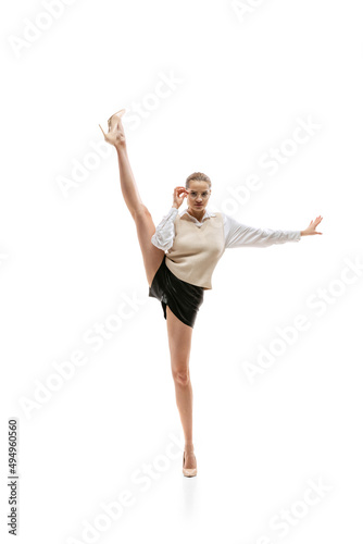 Portrait of young beautiful girl, business woman in stylish official cloth isolated over white studio background