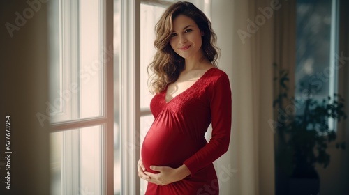Portrait of Young beautiful pregnant woman wearing red shirt standing near window at home