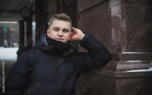 Portrait of young blonde guy Nordic appearance, lifestyle of young people. Handsome guy close up, winter day thinking about something