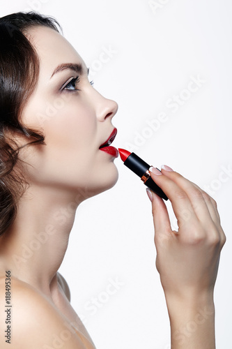 Portrait of young brunette woman. Girl with lipstick in hand. Female lips beauty makeup concept