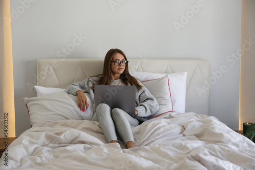 Portrait of young brunette woman wearing a sweater and eyeglasses at home in her bed and working on a laptop. Remote job concept. Background, copy space, close up.