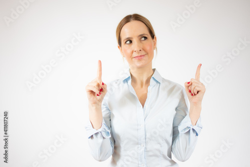 Portrait of young business woman pointing up over white background