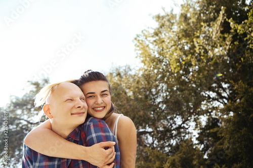 Portrait of young couple having fun and laughing in park. Girlfriend hugs her boyfriend from behind, smiling and looking straight at camera.