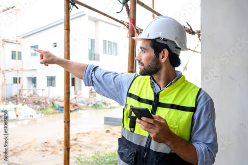 portrait of young engineer in vest with white helmet standing on construction site, smiling and holding smartphone for worker, internet, social media.