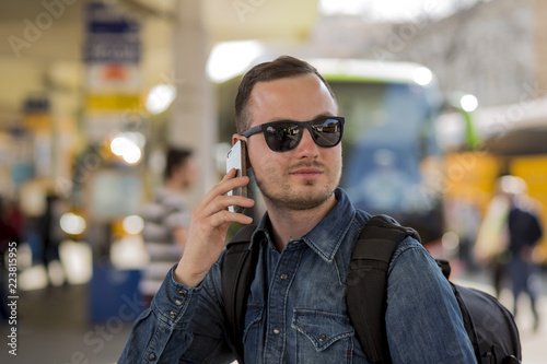 Portrait of young handsome smiling man waiting at the bus stop with modern designed smartphone in hand. Traveling by eco friendly alternative to car. Nice summer sunny weather and warm colors photo.