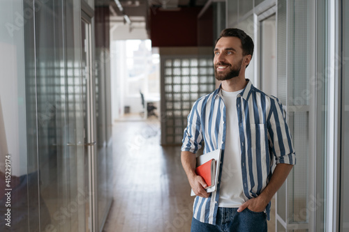 Portrait of young handsome student holding laptop looking away, education concept