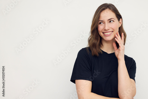 Portrait of young happy woman smiling on white background while looking to the left. Big smile on her face, looking beautiful and cute and with copyspace.