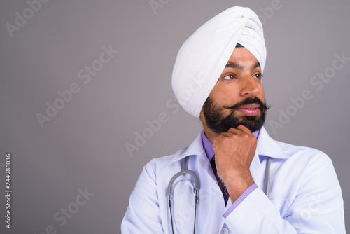 Portrait of young Indian Sikh man doctor thinking