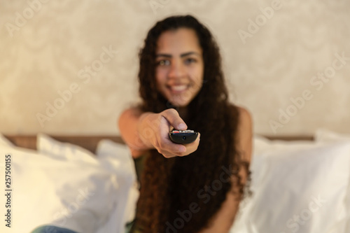 Portrait of young latin woman with remote lying in bed and watching TV. Television concept.