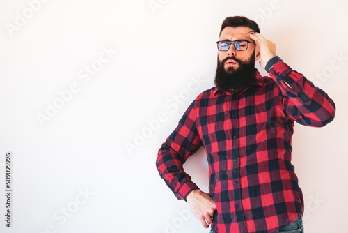 Portrait of young man who is tired and overworked. Copy space on image for your text or advert.