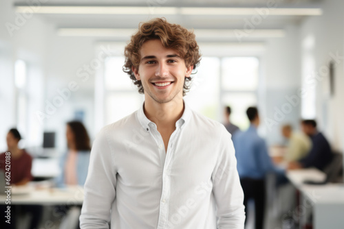 Portrait of young manager standing in busy office looking at camera.