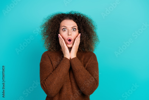 Portrait of young shocked lady in brown pullover touching cheeks looking at hypermarket christmas sale isolated on blue color background