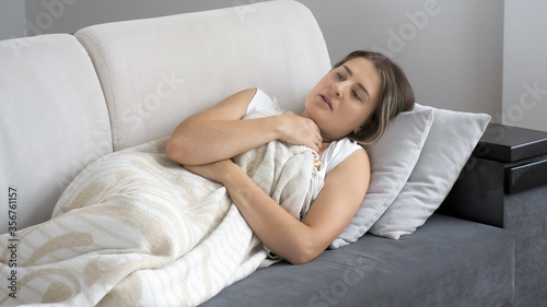 Portrait of young sick woman feeling unwell lying under blanket on sofa