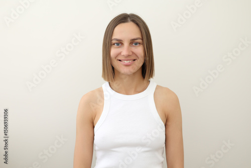 Portrait of young smiling caucasian european attractive woman 30s with straight-shoulder length brown hair in white tank top looking at camera isolated on light background. People lifestyle concept.