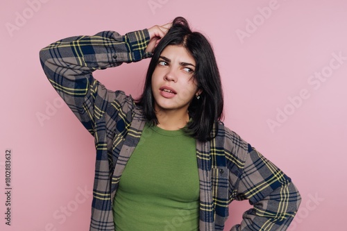 portrait of young woman displays confusion as she scratches her head with a plaid shirt and green shirt on pink background