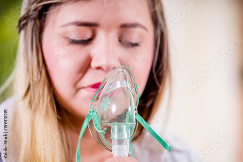 Portrait of young woman using nebulizer for asthma and respiratory diseases at home