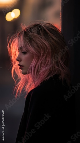 Portrait of Young Woman with Caramel Blonde Hair and Bold Pink Streak