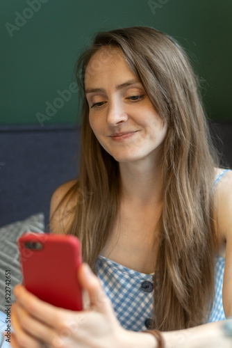 Portrait of young woman with phone in her hands in cafe. Girl with long brown hair holds smartphone. Vertical frame.
